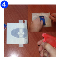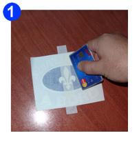 La meilleure façon d'appliquer un décalque est d'utiliser un racloir (SQUEEGEE). Prenez l'autocollant et le poser sur une surface plane et racler si la couche supérieure adhère à nouveau à l'autocollant lui-même. Ensuite, tirez la bande de transfert arrière lentement à un angle de 45 degrés. Une fois que l'autocollant n'est plus sur le papier de cire, il peut être appliqué à presque toutes les surfaces choisi.